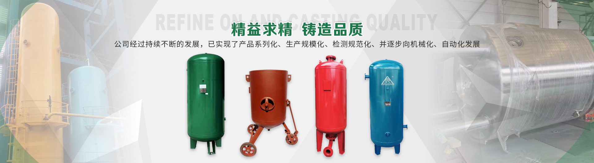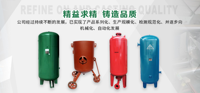 本企業(yè)產(chǎn)品有眾多產(chǎn)品分類,儲氣罐、磨料桶、碳鋼儲氣罐、不銹鋼儲氣罐、中高壓儲氣罐、臥式儲氣罐、緩沖罐、隔膜罐、噴砂罐、分氣缸、以及其他的定做非標(biāo)產(chǎn)品等,產(chǎn)品廣泛應(yīng)用于化工、制藥、橡膠、石油、食品、機(jī)械等行業(yè)。
